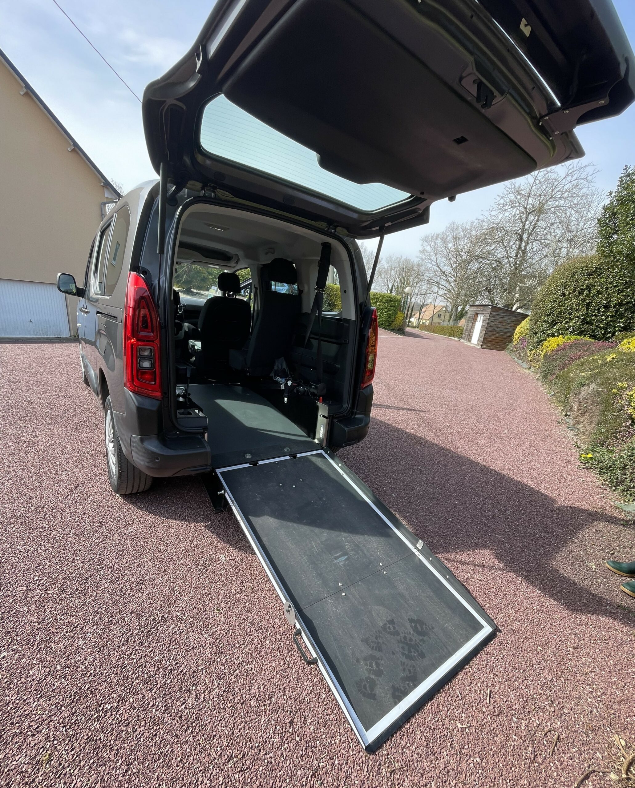 3 places + fauteuil électrique avec rampe d'accès arrière, Système d’arrimage de fauteuil roulant, treuil de chargement de fauteuil à levage électrique, Plateau de transfert.
