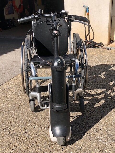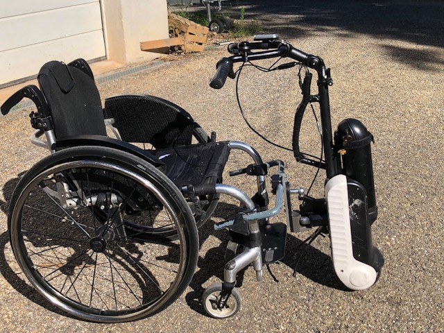 Motorisation pour fauteuil roulant marque REHABILITY modèle Slave (Allemagne). Batterie 36V 250Wh Lithium Panasonic de 2023 (transportable en avion avec certificat ) Roue de 6 pouces, frein à tambour. Puissance 250W, légère 8kg et facile à mettre en place sur le fauteuil.