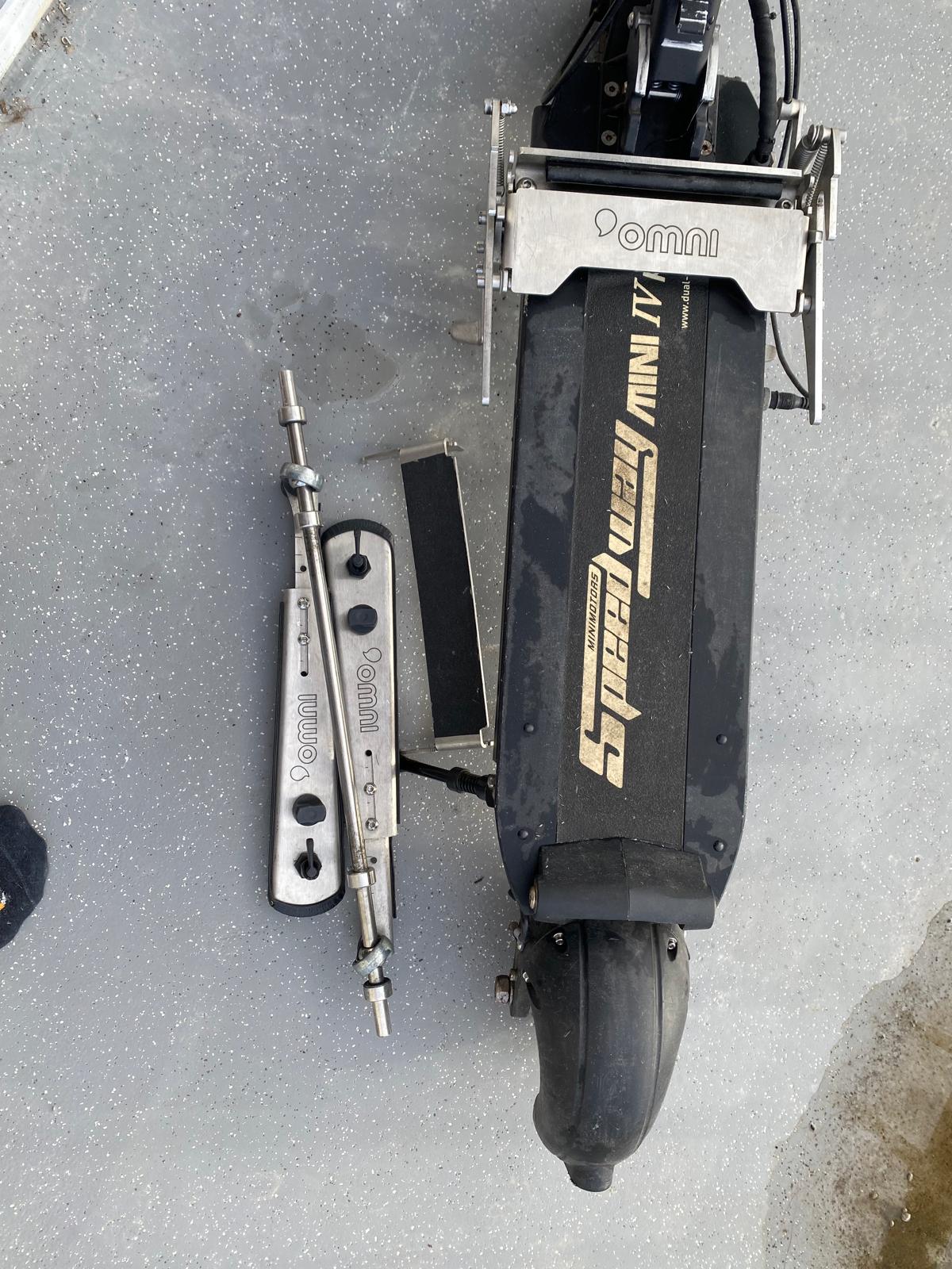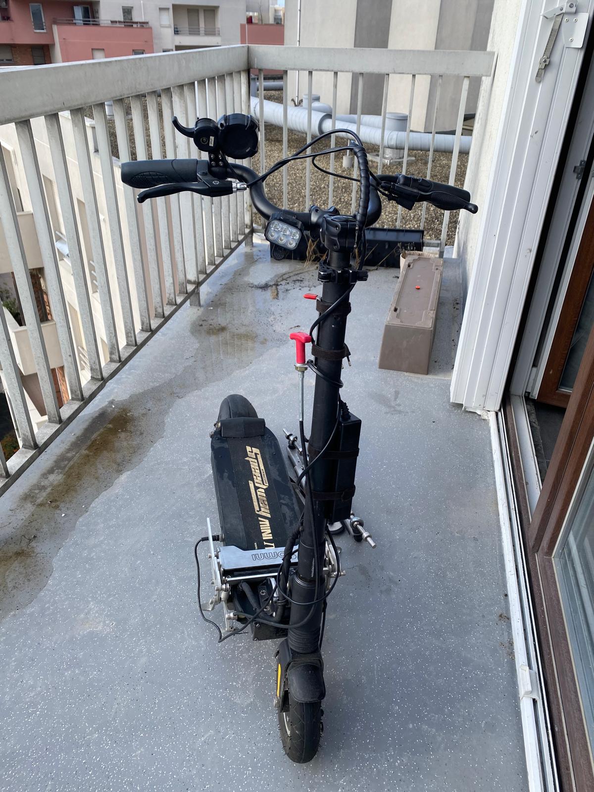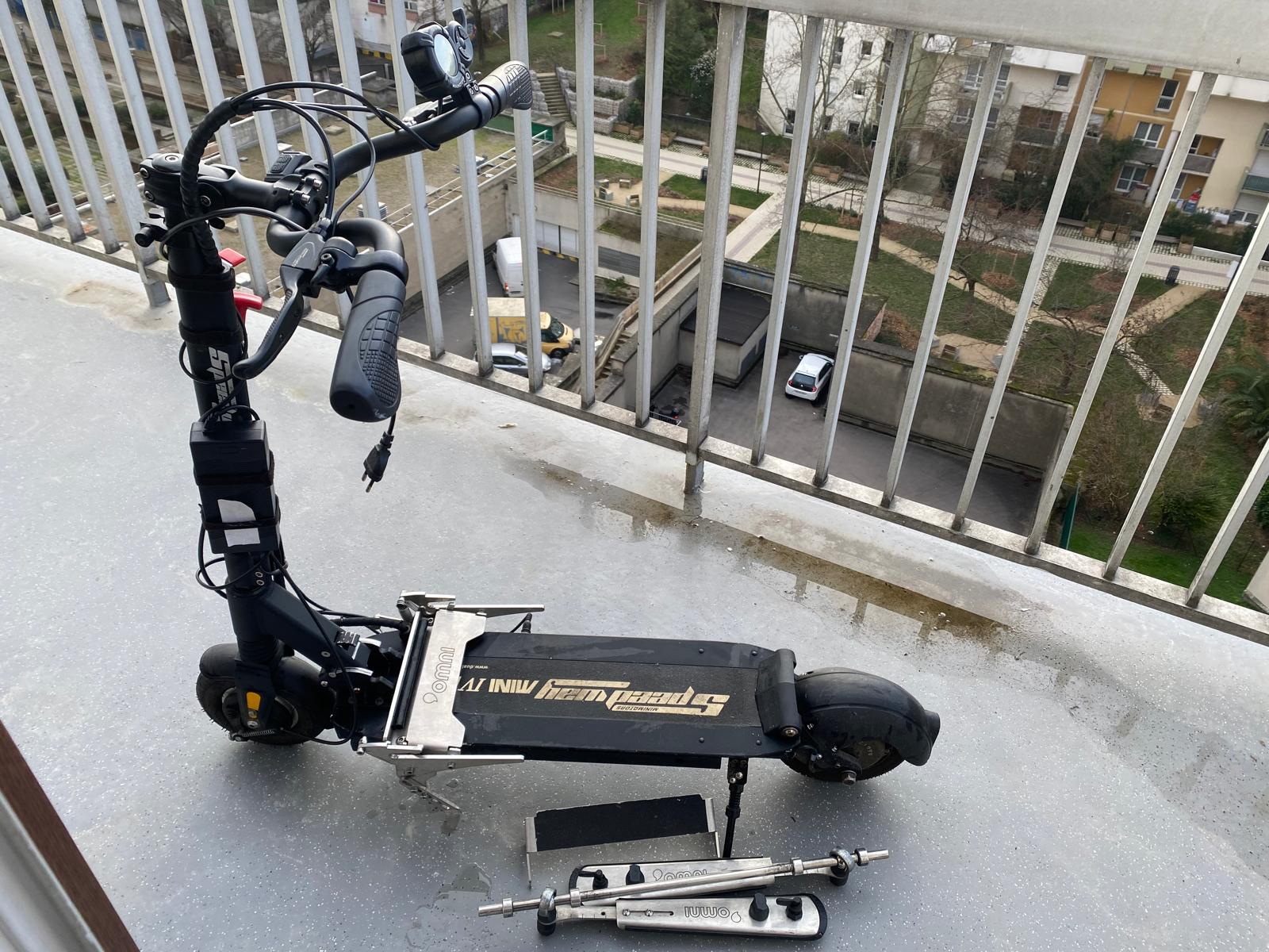 Le système est installé sur une trottinette Joyor modifiée (modification réalisée par Omni en lien avec le constructeur) pour une conduite plus adaptée en fauteuil roulant.